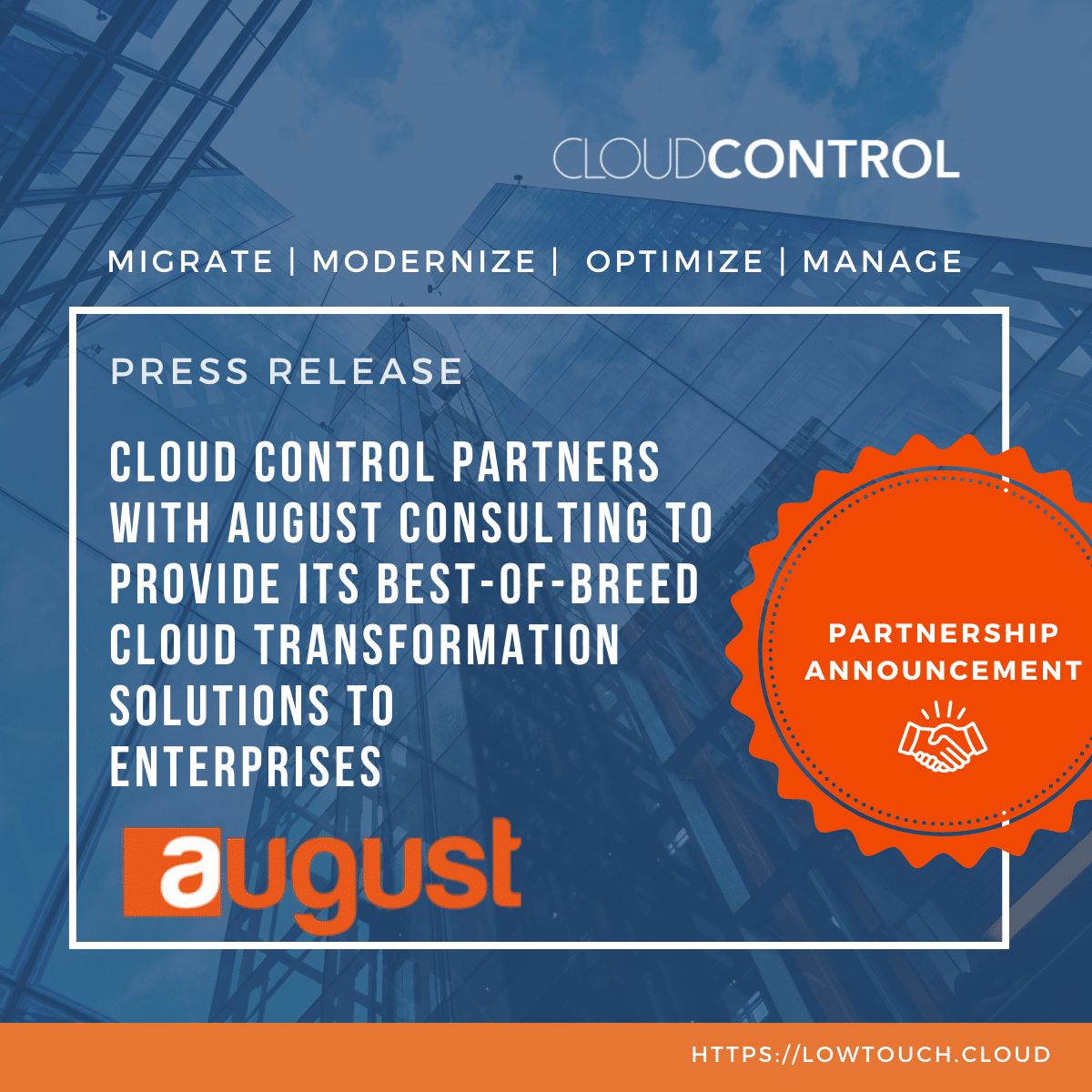 CLOUD CONTROL SOLUTIONS INC. AND AUGUST CONSULTING INC.Cloud Control Solutions Inc. (CCS), a leading provider of Cloud Application Migration, Modernization and Site Reliability Engineering (SRE) solutions, is pleased to announce a new partnership with August Consulting Inc. (August), a Digital Transformation Services pioneer and Cloud Service provider with extensive relationships with F500 customers.