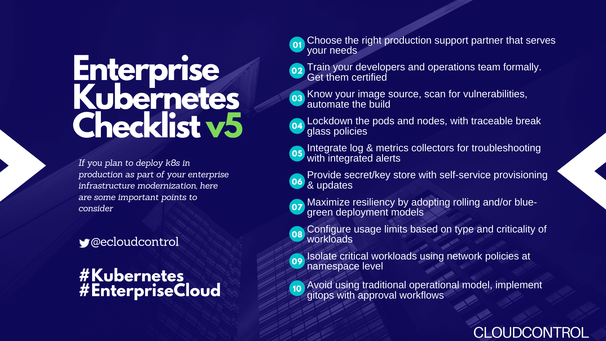 Kubernetes Production Readiness Checklist for EnterpriseRunning and managing applications anywhere, on-premise or cloud, with agility and scalability is why Kubernetes is the number one orchestrator. Its ability to self-heal nodes and applications, autoscale the infrastructure and adapt to the expanding business is very attractive proposition for enterprise. Kubernetes as technology is still emerging and rapid changes are taking place within its framework as well supporting toolsets through multiple open source projects.